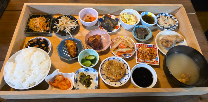 היה פער משמעותי בין העובדה שהיו במקום ארבעה שולחנות ולא היו בו אורחים נוספים, ובגדול נראה כמו הקפה של הנכד של הזקנות מהפרק הקודם, לתפריט המגוון שכלל גם מגוון רחב של ארוחות צהריים, שתיה וקינוחים, ולעובדה שהעובד/טבח/מלצר/בעל הבית (כנראה שכל התשובות נכונות) ידע אנגלית ויכולנו לתקשר איתו בקלות. אני לקחתי ארוחה יפנית של 18 מנות קטנות, ודני לקח אורז עם קארי. המנות של שנינו היו מצויינת, ורוב המנות בארוחה שלי הפתיעו לטובה. לאחר מכן הזמנו וופל בלגי עם מייפל, בננה ואננס. המלצר הגיע לעדכן שהאננס נגמר ושאל איזה פרי נרצה במקום (תותים) ואז חזר שוב מאושר לבשר שהוא טעה ושיש אננס! גם הקינוח היה טעים, ובשלב מסוים בארוחה הגיעו עוד שני זוגות אורחים לקפה. העברנו שם שעה וחצי בנעימים וסגרנו את הפינה של ארוחת הצהריים (עניין חיובי כשלעצמו, היות וידענו שעל האי עצמו אין חנויות נוחות או מסעדות למעט מסעדת המלון).