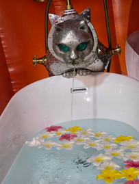 ב- MASK [MEGA ART STORAGE KITAKAGAYA]. יש לאומן הזה סדרה של יצירות אומנות באותו נושא של חתולי חלל שהוא הציג בהרבה מאוד מקומות ואף מיצגים קבועים. הפעם התערוכה נדדה ל-MASK וכללה אוסף נפלא של חתולי חלל בשלל גדלים, סגנונות וצורות, כמו גם יצירות נוספות שלו. נהננו מכל רגע. למעשה עוד בדרך לתערוכה, ועל אף הגשם, עצרנו לצלם מספר שלטים שהצביעו לכיוון התערוכה, ובדיעבד התברר לנו שגם הן יצירות של אותו אומן.